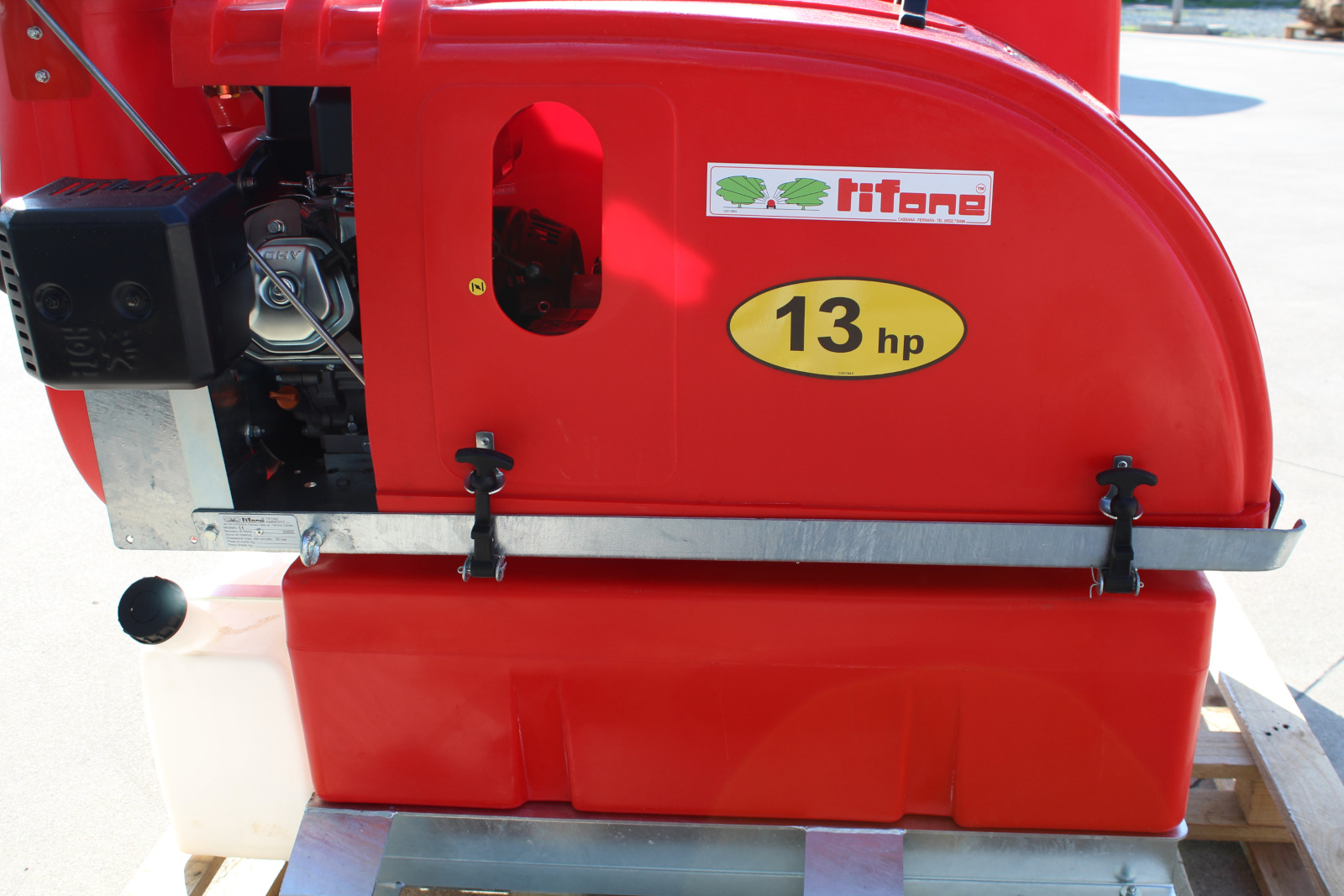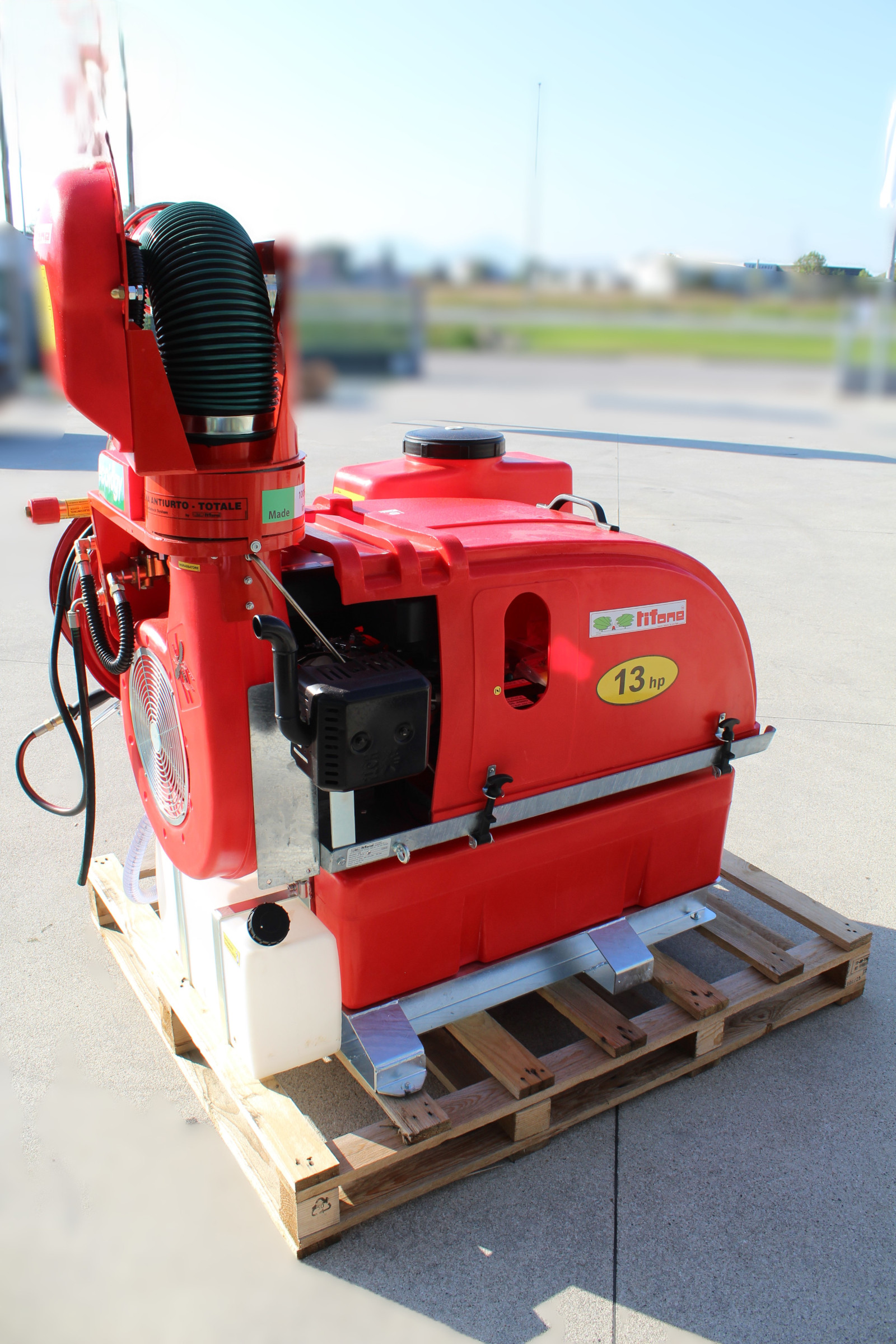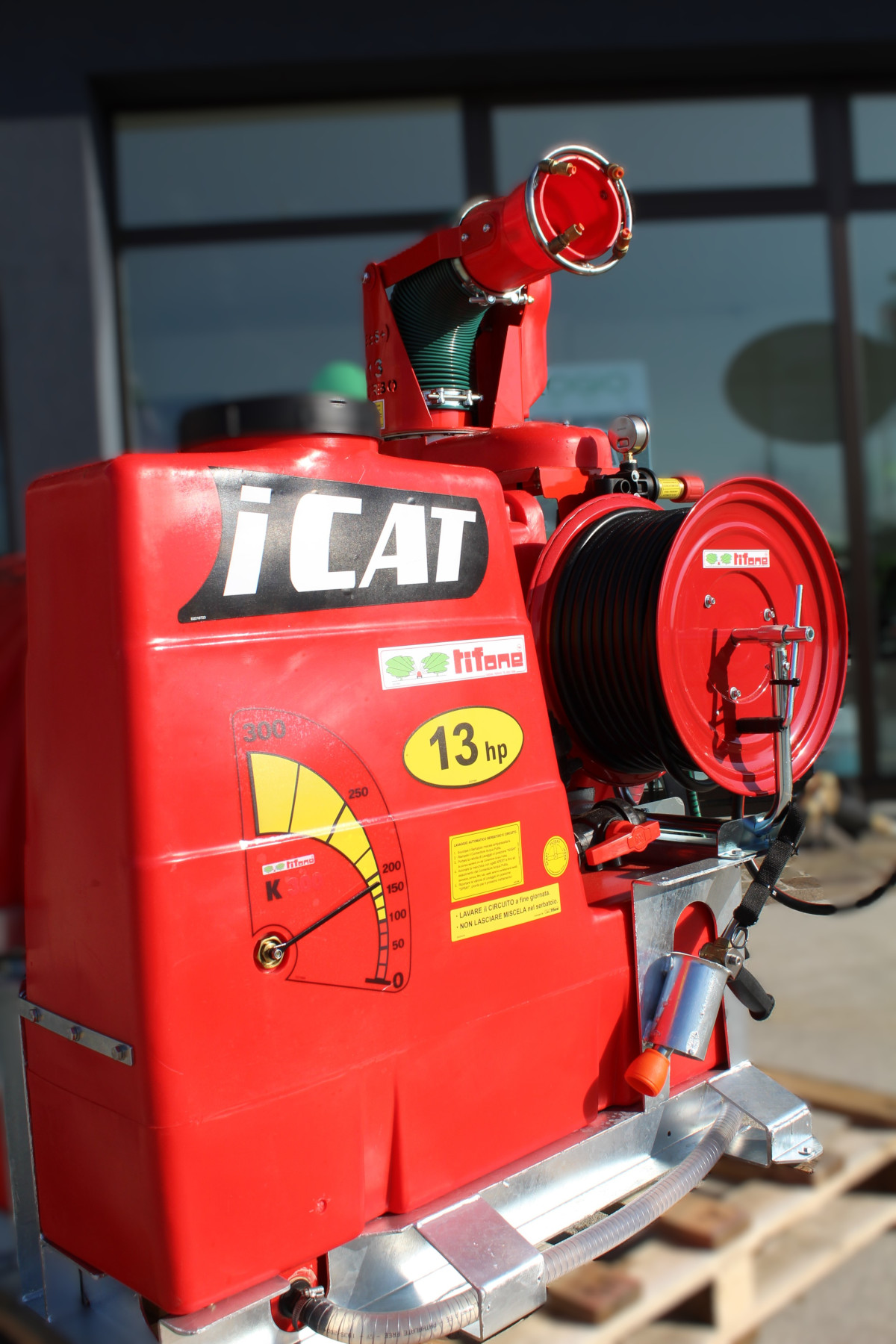Atomizzatore modello ICAT KB 13 Hp Benzina Kompact 300 Lt., le caratteristiche principali sono: • Dimensioni (La x Lu x Al): 85 x 120 x 162 cm • Peso 245 kg senza accessori e vuota • Motore Rato, 13 hp benzina con avviamento elettrico; • Pompa TEA 430 a tre membrane in Viton, collegata al motore tramite riduttore e mono cinghia; • Serbatoio Rosso 315 litri in polietilene sagomato con minimo ingombro con torre antidispersione, antialghe e grande livello meccanico; • Cannone Flexigun omni-direzionabile, movimento orizzontale e verticale con sistema Autotensor e sistema di protezione antiurto, fessura di uscita 165 mm con 4 ugelli con anti-gocciolamento a risucchio istantaneo, getto fino a 15-18 metri; • Regolatore di pressione Telecontrol – Exact ad alta precisione con manometro e scala lettura ogni 0,5 bar; • Agitatore automatico da circuito; • Macchina telecomandata dal posto di guida dell’automezzo tramite pulsantiera che integra tutti i comandi: accensione, accelerazione e arresto motore, apertura-chiusura erogazione, movimento del cannone e altri. • Filtro automatico a circolazione continua integrato nel regolatore di pressione, non richiede manutenzione e né pulizia. • Scarrabilità totale con muletto e paranco • Rullo avvolgi tubo manuale con 50 mt di tubo 10x19 ad alta pressione e Lancia mitra con tracolla;