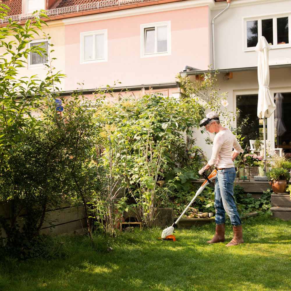 Decespugliatore STIHL FSA 45 a batteria compatta e integrata per semplici lavori di rifinitura e pulizia vicino casa. Batteria agli ioni di litio integrata con indicazione dello stato di carica, asta e impugnatura regolabile senza l'uso di utensili, angolo di lavoro nel gruppo falciante regolabile anche per tagli angolari verticali, cambio semplice tra lama PolyCut e fili falcianti senza sostituzione della testina falciante e archetto distanziatore.